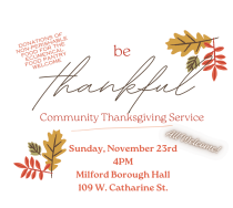 Join the Milford Ecumenical Community on Sunday, November 23rd at 4:00 PM for his year’s community wide Thanksgiving service. The service will be held at Milfor...