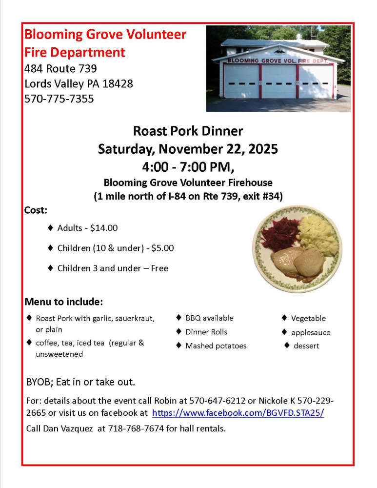 Join the Blooming Grove VFD for their Annual Road Pork Dinner. Eat in or Take Out!
